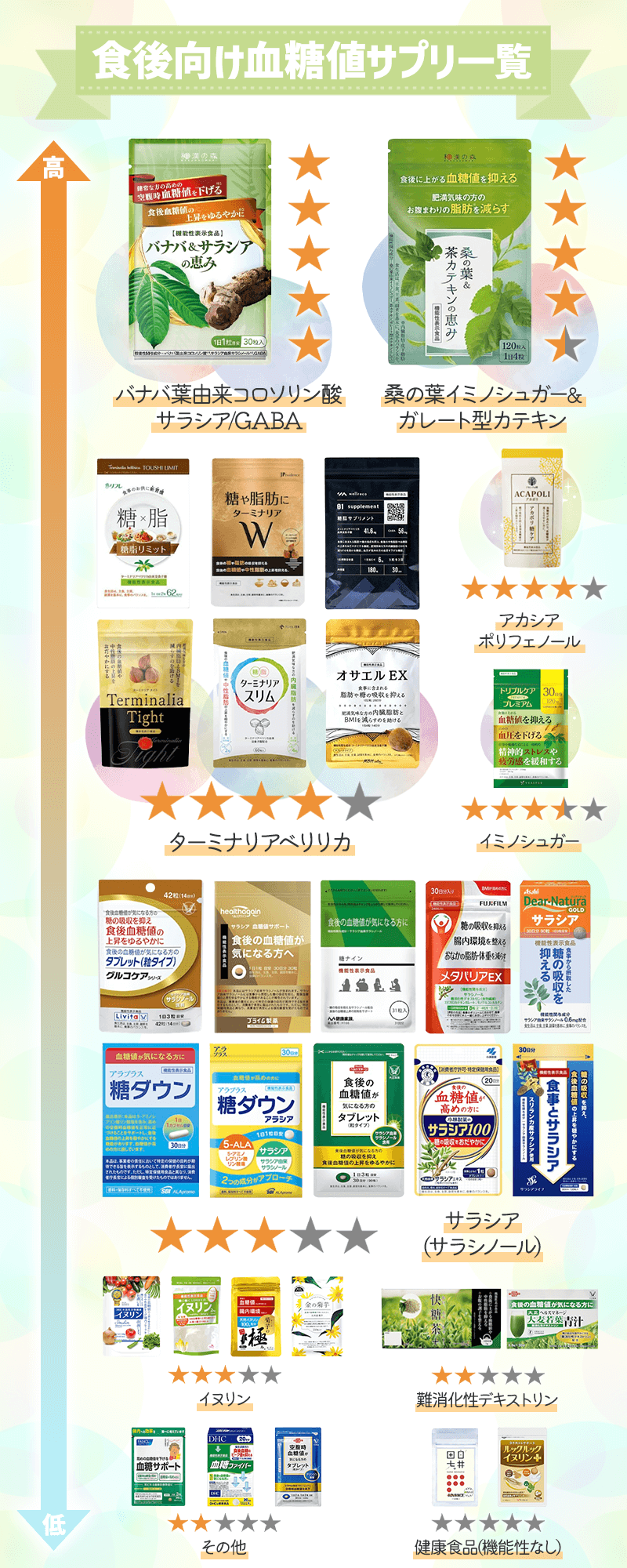 ここで、食後の血糖値を抑える成分が含まれている人気サプリメント一覧をまとめてみました!