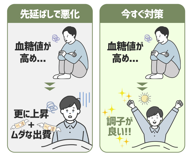 正常な血糖値を取り戻し、活力に満ちた健康な人生を取り戻すためには、1日でも早く行動するのがおすすめです。