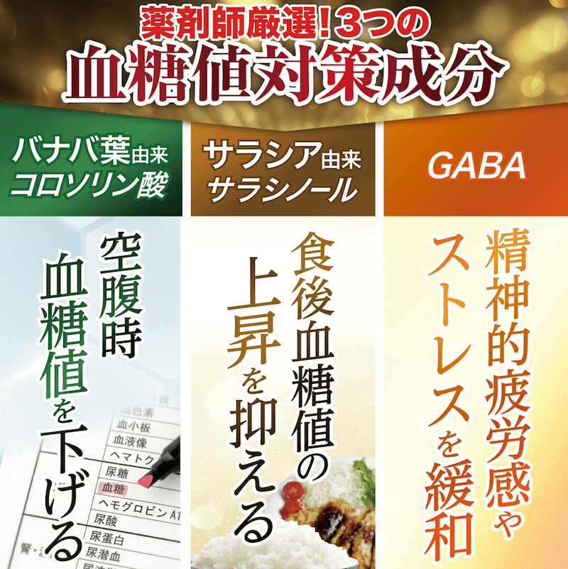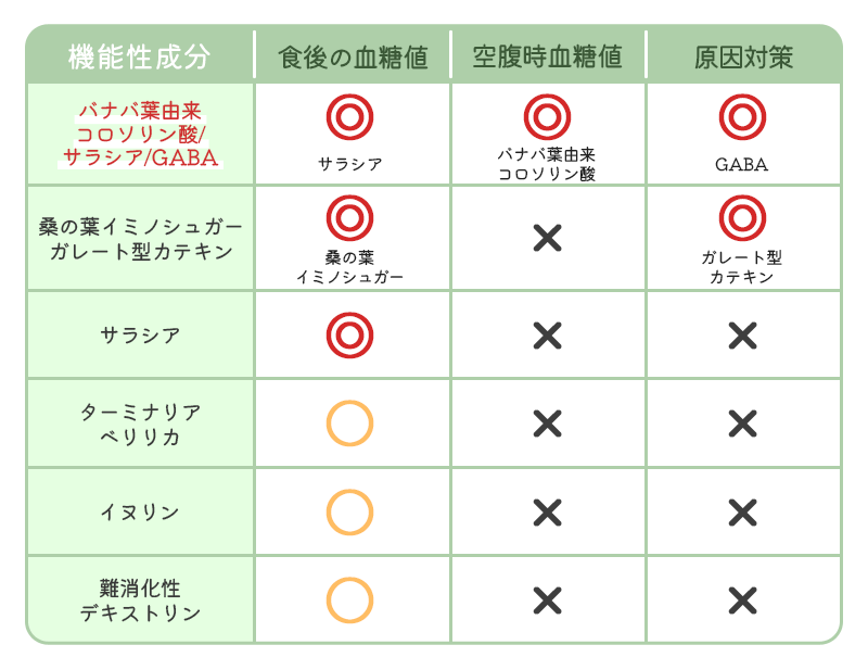 このように比較すると、バナバ&サラシアの組み合わせは、空腹時と食後の血糖値のW対策が可能で、同時にGABAでストレス対策ができるため一番効果的という結果になりました。